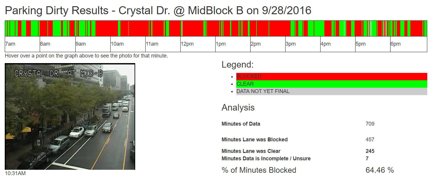 The system consists of two pieces. The first is an application that saves a screenshot of various Arlington County Traffic Cameras every minute along with the date and time that it was saved. The second is this website, which displays those screenshots to users of the site and records whether the bike lane is blocked.